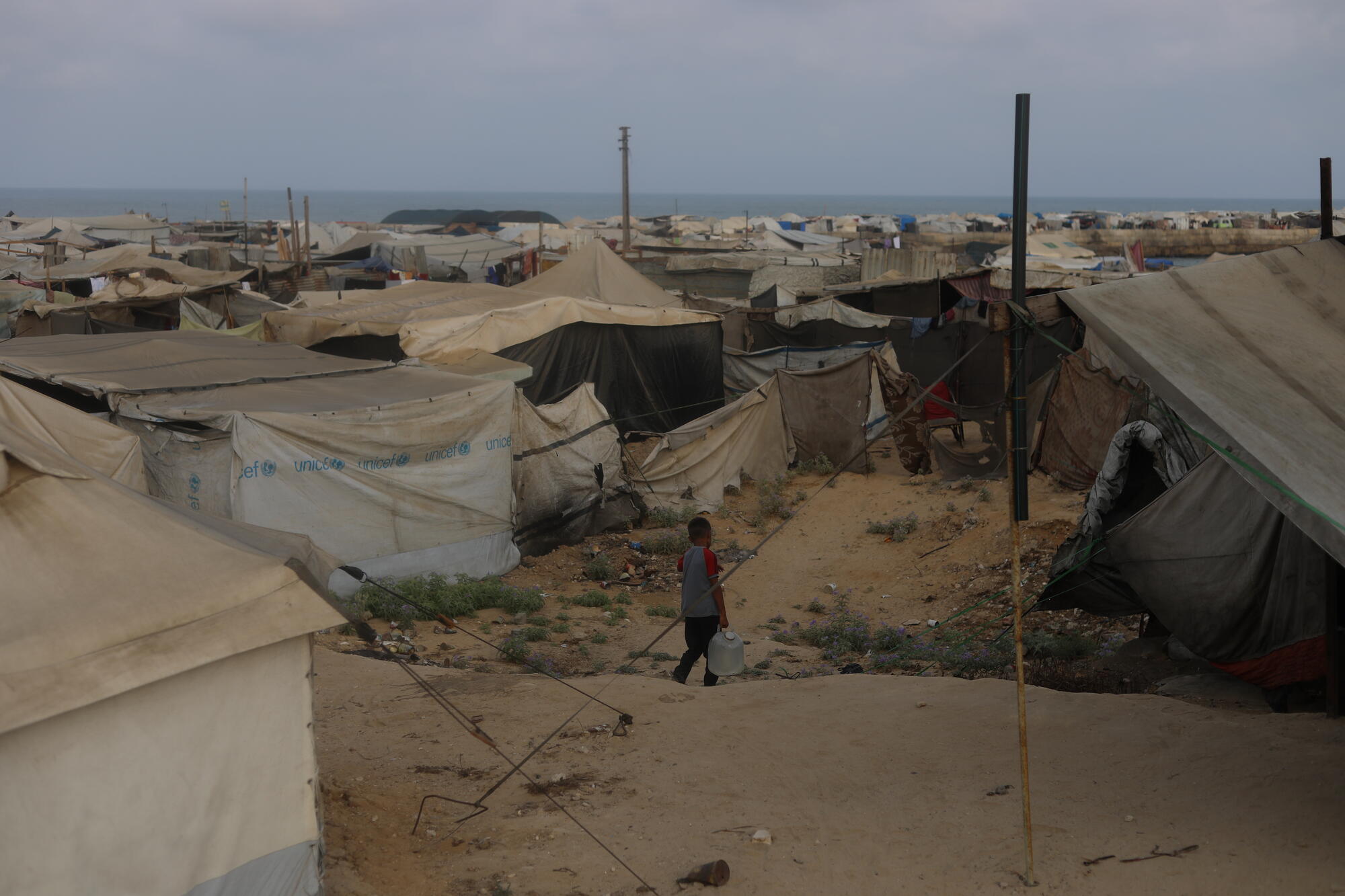 Młody chłopiec niesie kanister z wodą przez obóz dla uchodźców w Chan Junus, gdzie połatane i zniszczone namioty zapewniają niewielką ochronę przed warunkami atmosferycznymi. Strefa Gazy, 2025 rok
